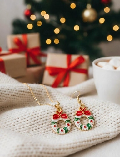 set di gioielli con ghirlanda natalizia: collana e orecchini natalizi rossi e verdi con fiocco per donna