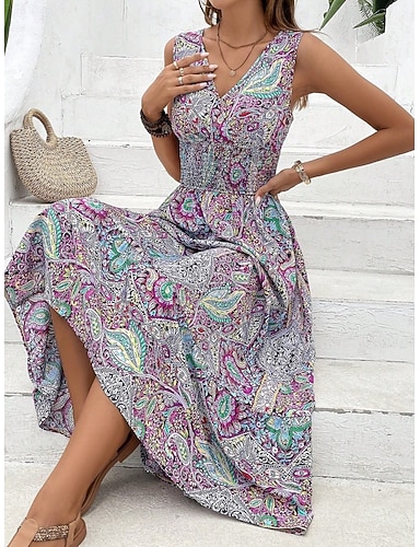 Per donna Abito maxi Abito Boho Abito Vintage Vestito Casual Elegante Moda Moderno All'aperto Spiaggia Vacanza Vestibilità regolare Paisley Senza Maniche Scollo a V Viola Estate Primavera