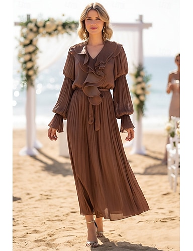 Linea ad A Lunghezza alla caviglia Abito da invitata a nozze Vestito a ruota Abiti per invitati a matrimoni Elegante Vintage Manica Lunga Scollo a V Festa in giardino Ospite di nozze con Pieghe