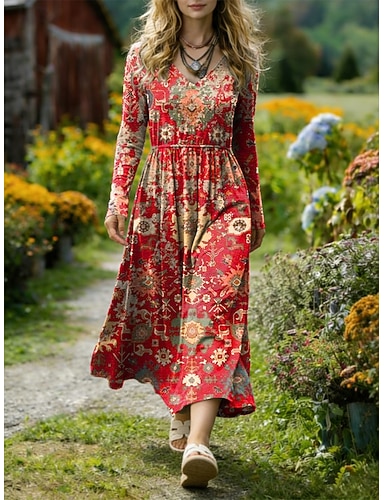Per donna Abito Midi Abito a trapezio Festa Casual Boho Data Vestibilità regolare Grafico Geometrico Manica Lunga Scollo a V Blu Rosso Blu reale Viola Estate Primavera