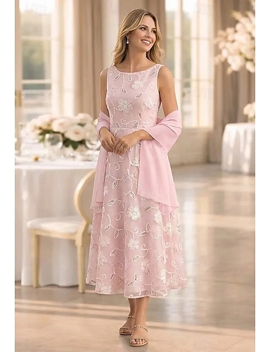 Due Pezzi Linea ad A Lunghezza Tè Perline ricamate Abito da invitata a nozze Abito Formale Abito da cerimonia per signora Senza Maniche Scollo a V Elegante Formale Ospite di nozze Chiffon Pizzo Abiti