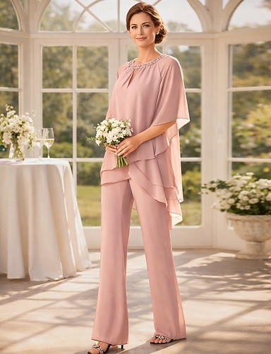 Due Pezzi Tuta Completo Pantalone Lunghezza al pavimento Abito da cerimonia per signora Manica 3/4 Collo gioiello Elegante Ospite di nozze Festa di fidanzamento Chiffon con Perline Arricciatura