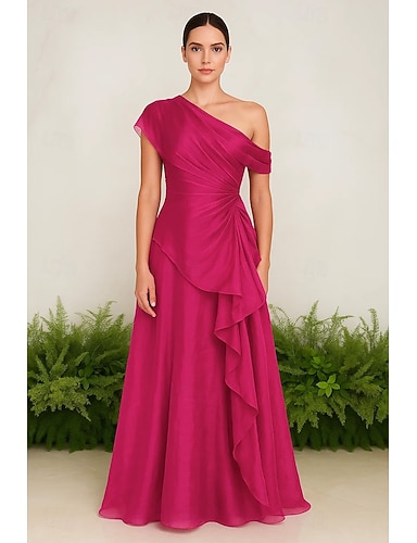 Linea ad A Lunghezza al pavimento Abiti da Ballo Abito da Sera Elegante Setoso Senza Maniche Monospalla Festa in giardino Matrimonio Tasca Raso Organza con Pieghe Arricciato Volant