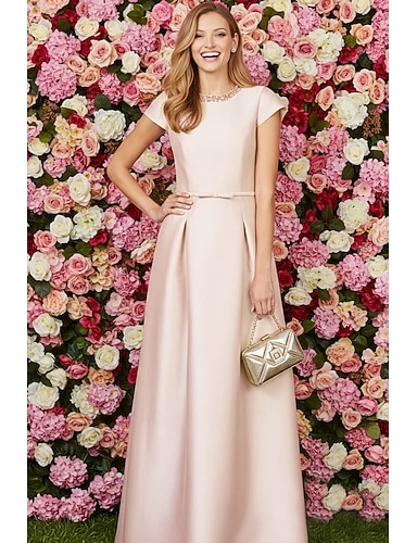 Linea ad A Lunghezza al pavimento Abito in Raso Abito da cerimonia per signora Manica Corta Manica a Cappuccio Girocollo Elegante Nascondi Pancia Formale Ospite di nozze Raso con Fascia / Nastro