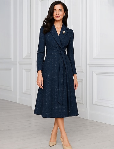 Abito da festa a linea A di lunghezza tè Abito da cocktail Abito da invitata di matrimonio Abito per la madre della sposa a maniche lunghe colletto da camicia elegante minimalista formale con cintura
