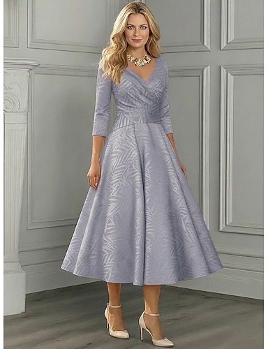 Linea ad A Lunghezza Tè Vestito da Festa Abito da Cocktail Abito da invitata a nozze Abito da cerimonia per signora Manica 3/4 Scollo a V Elegante Festa in giardino Matrimonio Formale Raso Crepe