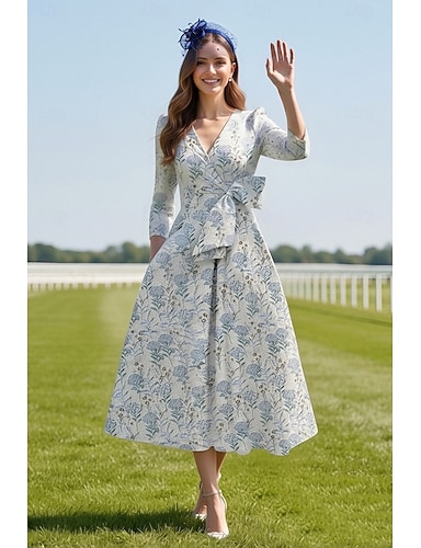 Linea ad A Lunghezza Tè Vestito da Festa Abito da Cocktail Abito da invitata a nozze Abito da cerimonia per signora Mezza Manica Scollo a V Elegante Formale Derby del Kentucky Raso con Stampa floreale