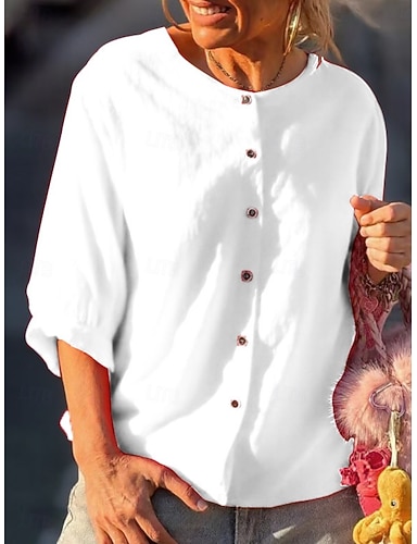 Per donna Finto cotone e lino Bottoni Tinta unica Vintage Elegante Essenziale Manica 3/4 Girocollo Top Regolari Quotidiano Blu Nero Bianco Giallo Rosso Estate Primavera Autunno