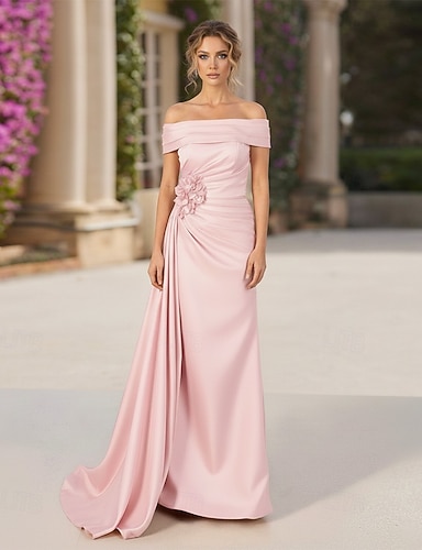 Sirena Tromba Strascico a Terra Abiti da Ballo Abito da Sera Da principessa Abito formale Elegante Manica Lunga Monospalla Matrimonio Formale Vestito Rosa Raso Elasticizzato con Pieghe
