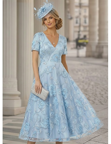 Linea ad A Lunghezza Tè Abito Formale Abiti da Cocktail Elegante Manica Corta Scollo a V Matrimonio Formale Pizzo con Fiore ricamato Fiori 3D Paillettes