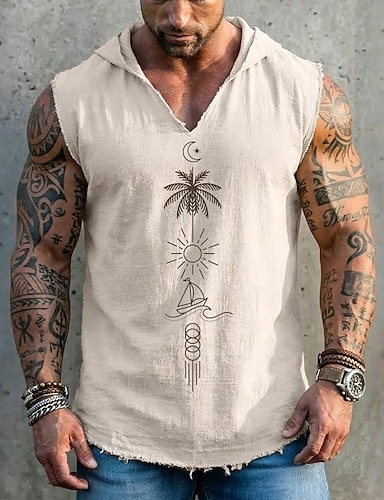 Felpa con cappuccio senza maniche da uomo con stampa geometrica di palma, sole, barca a vela e luna, stile boho costiero, canotta grafica, vestibilità ampia, scollo a V, orlo sfrangiato, estate,