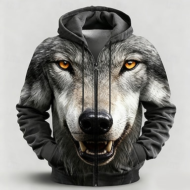 Per uomo Lupo Felpa con Cappuccio Giacca di pelle Felpa Fantasia Stampa su tutta la superficie Manica Lunga Con cerniera Abbigliamento casual alla moda Vacanza Uscire Nero Grigio scuro Cerniera