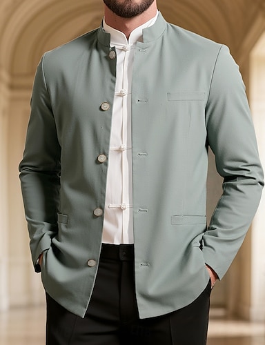 Per uomo Giacca di lino Formale Casa Bottoni Minimalista Primavera & Autunno Autunno Tutte le stagioni Tinta unica Attivo Vintage Colletto a Camicia Regolare Blu marino Verde Cachi Azzurro Giacca