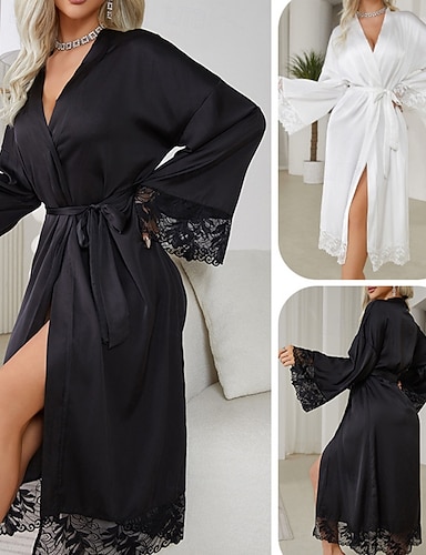 Per donna Accappatoio Casual Morbido Raso Colore Puro Pizzo Quotidiano Casa Da letto Manica Lunga Scollo a V Nero Bianco Estate Vestibilità regolare