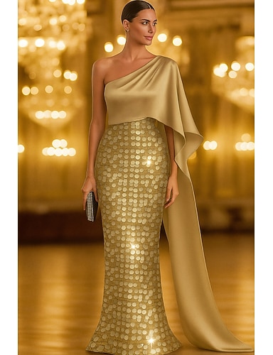 Tubino Colonna Lunghezza al pavimento Abiti da Ballo Abito da Sera Da principessa Abito formale Elegante Setoso Senza Maniche Monospalla Matrimonio Formale Abito Champagne per la Madre della Sposa