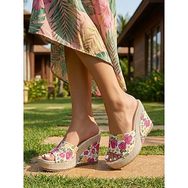 sandali da donna con zeppa trasparenti e floreali rosa, tacchi a plateau trasparenti per gli invitati ai matrimoni all'aperto in giardino
