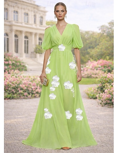 Linea ad A Lunghezza al pavimento Abito da Sera Abito formale Elegante Pastello Matrimonio informale / diurno Manica Corta Scollo a V Matrimonio Formale Chiffon con Fiori 3D Arricciato