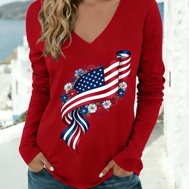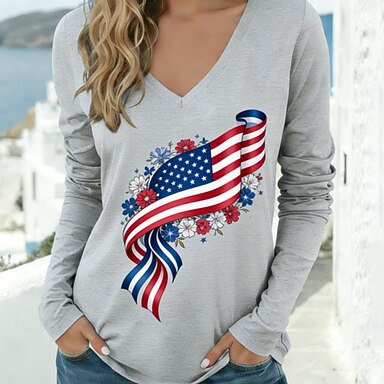 Giorno dell'Indipendenza Americana Per donna Maglietta Stampato Grafico Bandiera Elegante Classico Casual Manica Lunga Scollo a V Top Regolari Quotidiano Uscire Weekend Rosso Blu marino Grigio chiaro