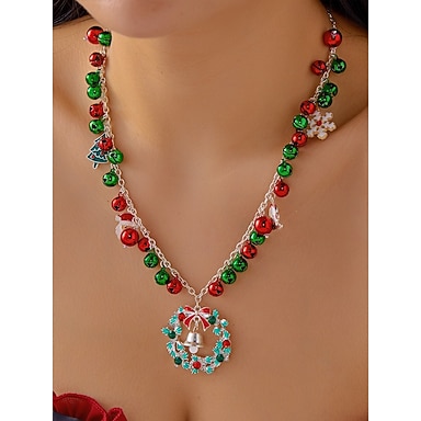Collana natalizia da donna in lega con campanellini rossi e verdi, ornamento a forma di fiocco di neve, perfetta per la moda delle feste e come regalo festivo