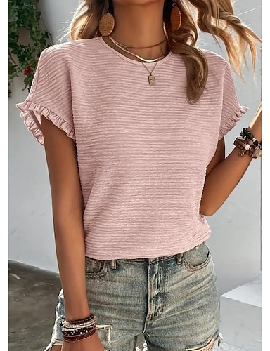 Per donna Maglietta Testurizzato Volant Tinta unica Elegante Vintage Moda Manica Corta Manica a pipistrello Girocollo Top Regolari Casuale Quotidiano Uscire Blu Nero Bianco Rosa Verde Estate Primavera