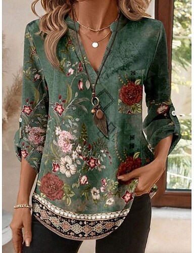 Per donna Camicia casual Blusa Stampato Floreale Grafico Elegante Vacanza Casual Manica 3/4 Scollo a V Top Regolari Lavoro Spiaggia Ferie Blu Rosa Verde Estate Primavera Autunno Inverno