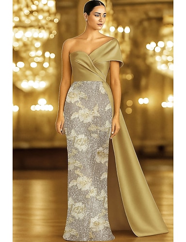 Tubino Colonna Lunghezza al pavimento Abiti da Ballo Abito da Sera Da principessa Abito formale Elegante Setoso Senza Maniche Monospalla Matrimonio Formale Abito Champagne per la Madre della Sposa