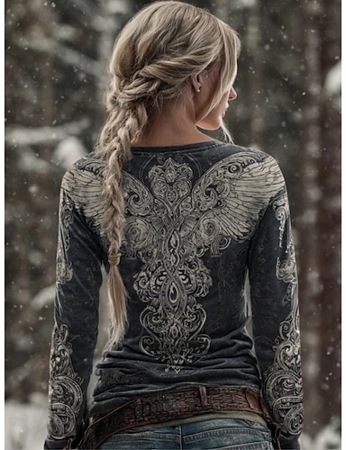 Per donna Maglietta Stampato Grafico Vintage Bohemien Vintage Moda Manica Lunga Girocollo Top Regolari Quotidiano Weekend Grigio scuro Primavera Autunno Inverno