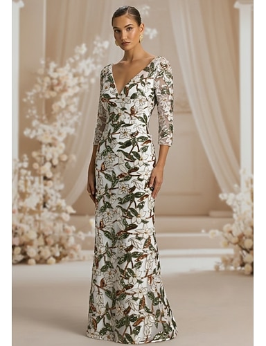 Tubino Colonna Lunghezza al pavimento Abito da Sera Elegante Scintillante Brillanti Manica Lunga Scollo a V Festa serale Matrimonio Tulle Con Paillettes con Stampa floreale Paillettes Perline ricamate