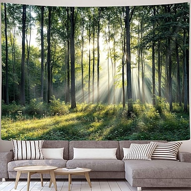 foresta illuminata dal sole, natura, paesaggio, bosco, arazzo da parete, alti alberi verdi, raggi di sole mattutino, fogliame nebbioso, fotografia realistica, arazzo da parete per soggiorno, camera da