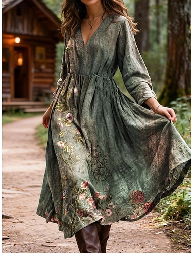 Per donna Abito maxi Abito Boho Abito Vintage Vestito Casual Vintage Quotidiano All'aperto Vacanza Vestibilità regolare Grafico Manica Lunga Scollo a V Verde Primavera Autunno