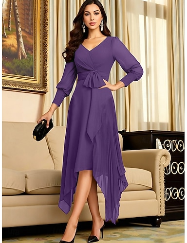 Linea ad A Asimmetrico Lunghezza Tè Vestito da Festa Abito da Cocktail Abito da invitata a nozze Abito da cerimonia per signora Manica Lunga Scollo a V Elegante Minimalista Formale Ospite di nozze