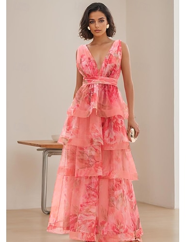 Linea ad A Lunghezza al pavimento Abito da Sera Elegante Senza Maniche Scollo a V Festa in giardino Matrimonio Organza con Stampa floreale Pieghe Volant
