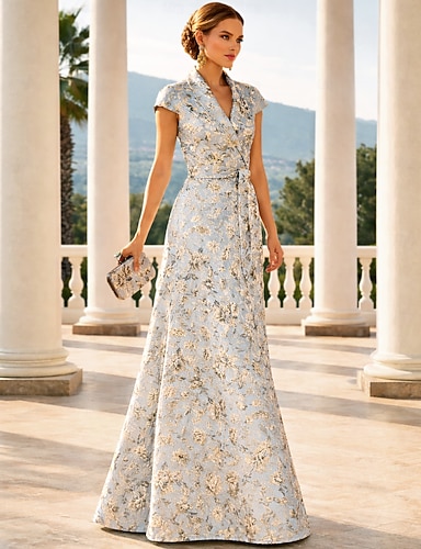Linea ad A Lunghezza al pavimento Abito da invitata a nozze Abito Formale Abito da sera Abito da cerimonia per signora Manica Corta Bavero Elegante Vintage Matrimonio Formale Jacquard con