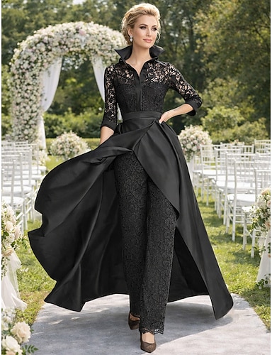 Tuta Completo Pantalone Lunghezza al pavimento Abito da cerimonia per signora Manica 3/4 Colletto a Camicia Vintage Festa Formale Ospite di nozze Serata Formale Raso Pizzo con Arricciatura