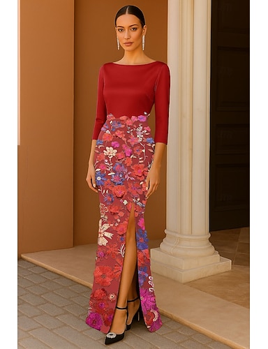 Sirena Tromba Lunghezza al pavimento Abiti da Ballo Abito da Sera Da principessa Abito formale Elegante Manica 3/4 Girocollo Festa in giardino Matrimonio Raso con Spacco Ricamo Applicazioni