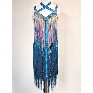 Abito da ballo latino con frange, nappe, cristalli/strass, allenamento prestazionale da donna, senza maniche, chinlon