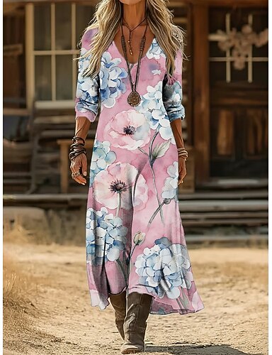 Per donna Abito lungo maxi Abito Vintage Vestito Casual Vintage Quotidiano All'aperto Vacanza Vestibilità regolare Floreale Manica Lunga Scollo a V Rosa Primavera Autunno