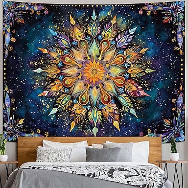 Arazzo da parete con mandala galassia bohémien, cielo stellato notturno, medaglione con piume di pavone, arazzo da parete, arte psichedelica e celeste, arredamento per la casa, camera da letto,