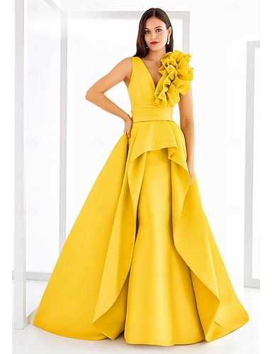 Linea ad A Lunghezza al pavimento Abito da Sera Elegante Setoso Senza Maniche Scollo a V Matrimonio Formale Tasca Raso con Volant Tasca