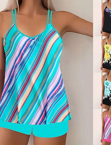 Per donna Costumi da bagno Tankini Due pezzi Gonna Costume da bagno Controllo della Pancia Vita alta Snello Senza schiena Vacanza Abbigliamento da Spiaggia A righe Collo a U Senza Maniche Costumi da