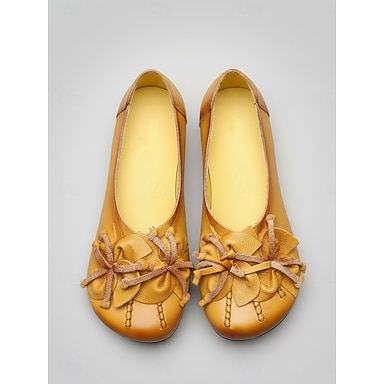 mocassini larghi da donna in pelle gialla lavorati a mano: comode scarpe basse con motivo floreale per un uso casual e quotidiano