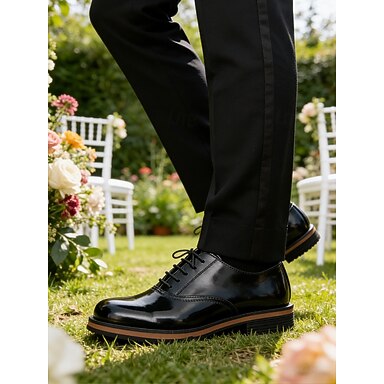 scarpe eleganti da uomo in similpelle verniciata nera, tomaia lucida con chiusura con lacci, stile formale di lusso per matrimoni, ricevimenti ed eventi serali