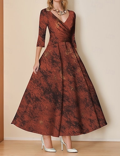 Linea ad A Lunghezza al pavimento Abiti da Cocktail Abiti da festa Elegante Manica 3/4 Scollo a V Festa in giardino Matrimonio Raso con Pieghe Arricciato