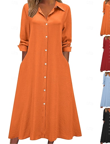 abito midi da donna, abito camicia, abito in finto cotone e lino, abito casual, abito a trapezio, moda, basico, moderno, quotidiano, vacanza, uscite, vestibilità regolare, semplice, manica lunga,