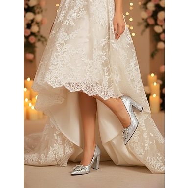 scarpe da sposa con tacco argentato da donna - eleganti décolleté con tacco a blocco e dettaglio fibbia in cristallo, scarpe da sposa classiche pensate per le spose