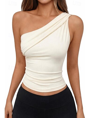 Per donna Maglietta Pieghe Tinta unica Elegante Caldo Senza Maniche Monospalla Top corti Uscire Abbigliamento da vacanza Abiti per la serata romantica Nero Avorio Estate Primavera