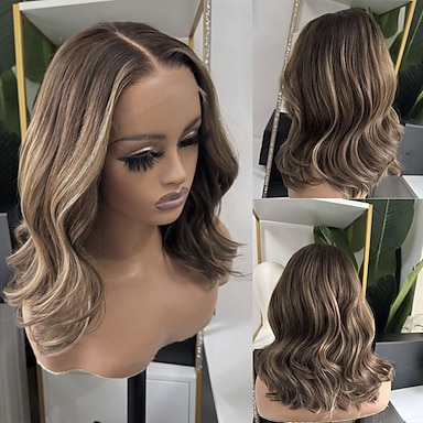 Parrucca brasiliana con chiusura in pizzo senza colla, capelli vergini non trattati, ondulati, 5x5, con mèches bionde e castane, parrucca frontale in pizzo 13x4 con capelli per bambini
