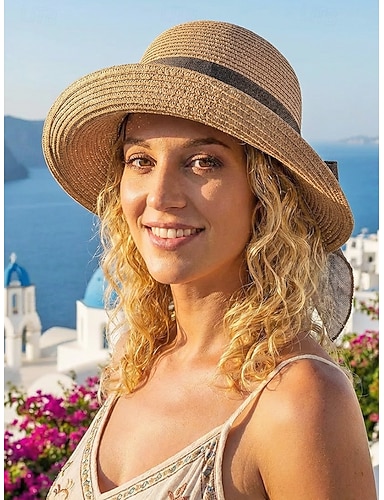 Cappello da sole da donna in stile bohémien intrecciato, pieghevole, a tesa larga, in paglia, con fiocco decorativo, disponibile in vari colori, ideale per vacanze al mare, abbigliamento casual