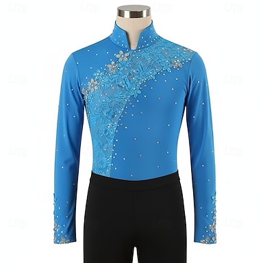 Maglia da pattinaggio artistico Per uomo Ragazzi Pattinaggio sul ghiaccio Top Blu Patchwork Spandex Alta elasticità Allenamento Competizione Vestiti da pattinaggio sul ghiaccio Classico Cristallo