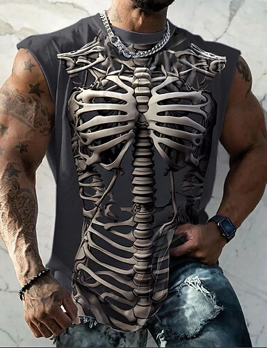 T-shirt senza maniche da uomo con grafica 3D di scheletro e gabbia toracica, stampa integrale, canotta anatomica con ossa, maglietta muscolare, Halloween, punk, streetwear, abbigliamento di design,